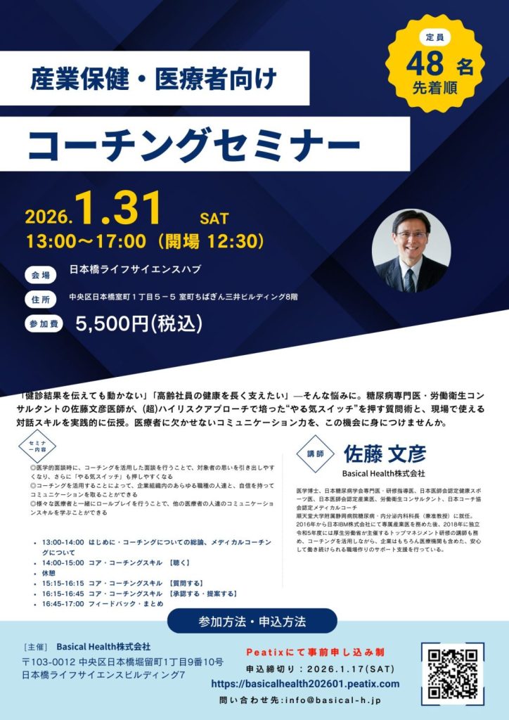 2026年1月31日(土)、Basical Health株式会社代表であり、糖尿病専門医・労働衛生コンサルタントの佐藤 文彦医師による「産業保健・医療者向けコーチングセミナー」を開催します。