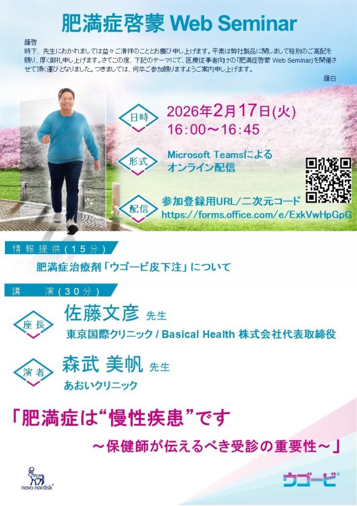 2026年2月17日(火)、Basical Health株式会社代表であり、糖尿病専門医・労働衛生コンサルタントの佐藤文彦医師が座長を務める、産業保健・医療者限定の「肥満症治療薬WEB講演会」が開催されます。